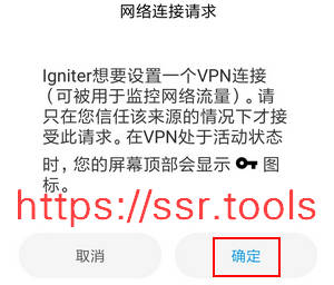 此时如果系统弹出窗口,提示网络连接请求,Igniter想要设置一个VPN连接,请点击确定按钮允许: