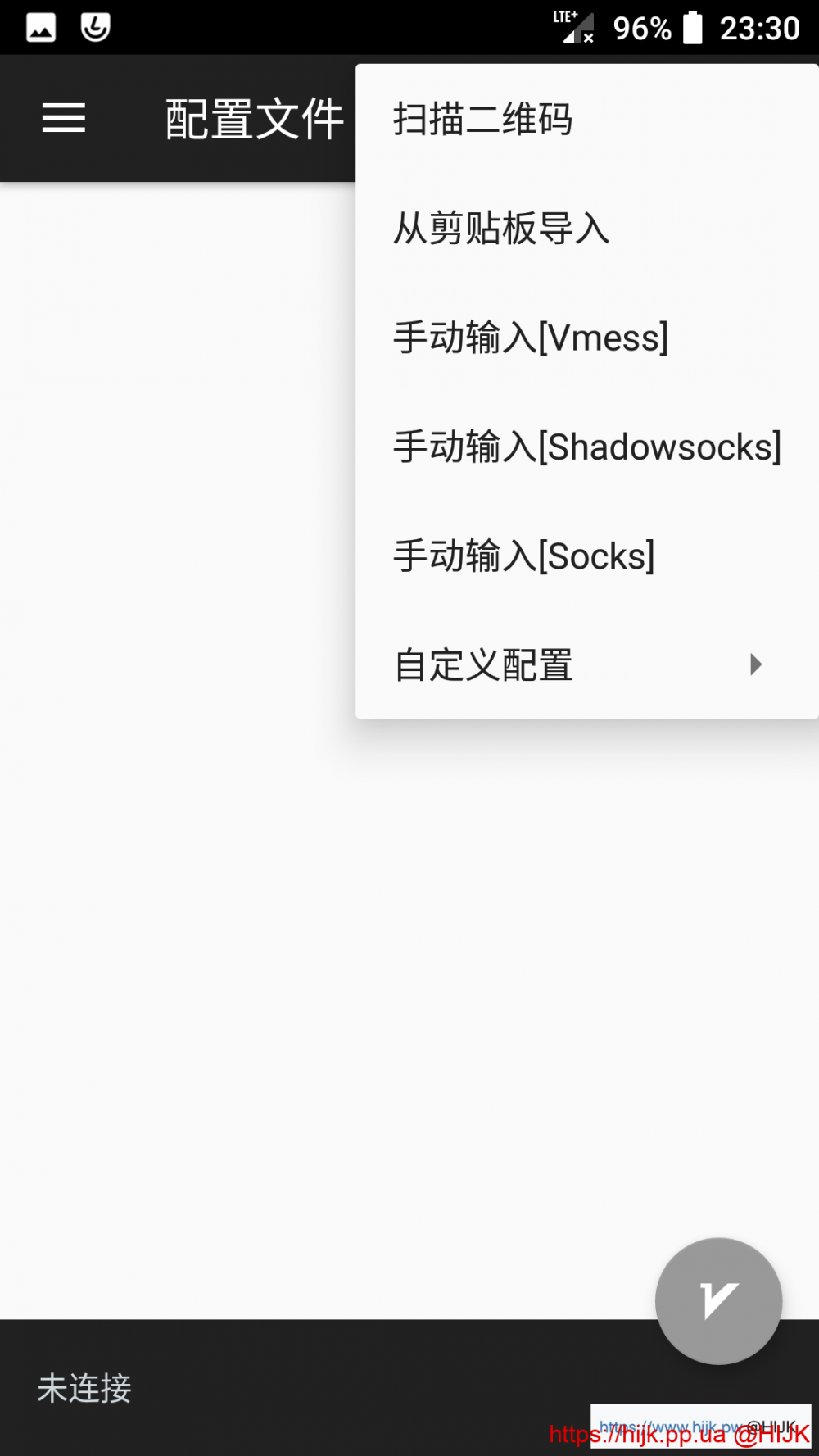 3. 点右上方的“+”,可以看到V2rayNG支持从二维码、剪切板导入,也可以手动配置vmess、ss等,还支持订阅(在自定义配置中):