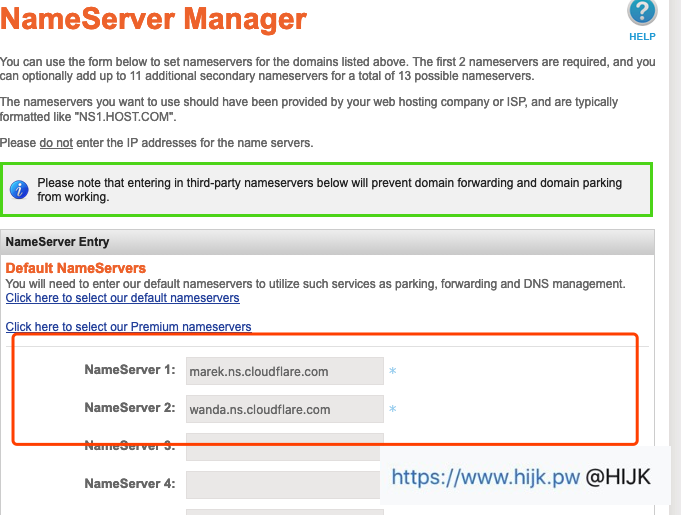 - 进入填写dns服务器界面,把默认的三行删了,在第一和第二栏填入cloudflare界面上出现的两个域名,例如:marek.ns.cloudflare.com 和 wanda.ns.cloudflare.com(注意:CF分配到每个人的DNS服务器都不一样,请按照你账号中出现的填写):