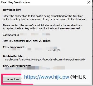 6. 首次连接服务器会出现主机指纹确认,点击“Accept and Save”:
