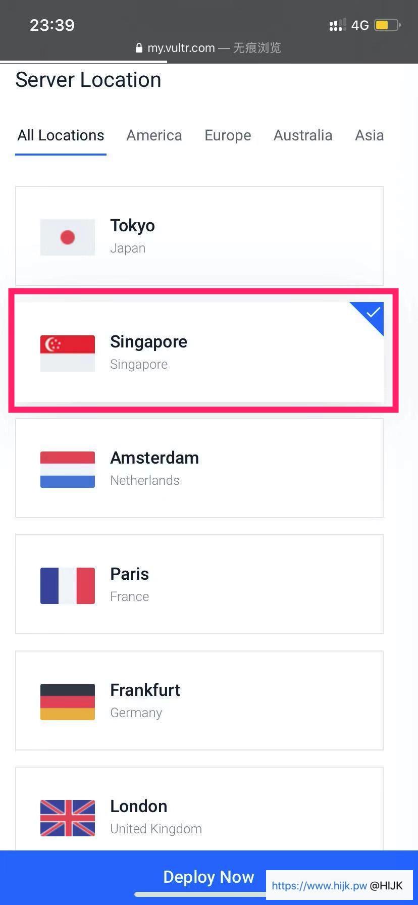 界面往下滑,选择机房位置(server location)。移动用户建议选择日本或者新加坡节点;联通用户建议选择新加坡、杉矶机、硅谷和西雅图机房;电信用户建议选择洛杉矶、硅谷和西雅图机房。因为vultr支持随时切换机房和更换ip,如果选择不满意可以根据下一节教程切换。本教程中选择“新加坡”机房: