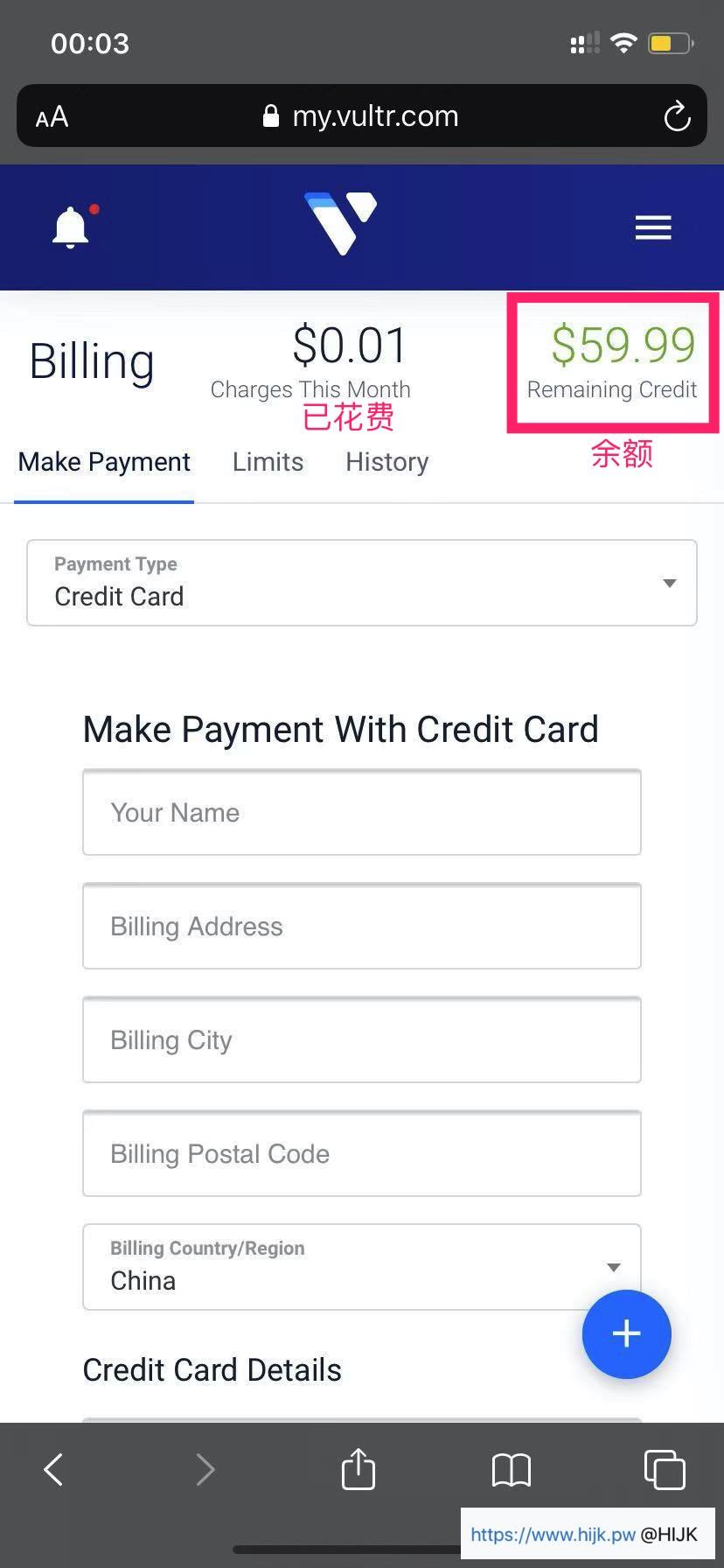 注册成功后,跳转到充值页面。这里我们选择支付宝(Alipay)付款(微信支付(WeChat Pay)操作类似),随便填写名字(your name),账单地址(billing address),任意选择一个城市(billing city),随便填一个5位数字邮政编码(billing postal code),随便选一个国家(billing country region),勾选同意协议(I Agree to the terms of service),点击下方的“pay with Alipay”付款按钮: