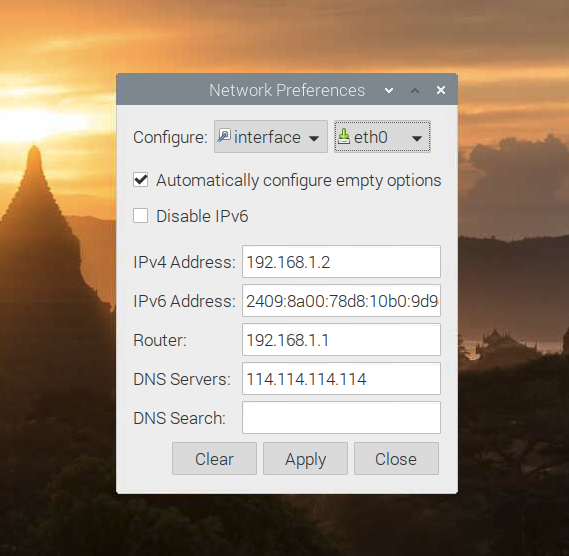 interface eth0 inform 192.168.1.2 static routers=192.168.1.1 static domain_name_servers=114.114.114.114 static ip6_address=2409:8a00:78d8:10b0:9d9e:1193:c495:228f