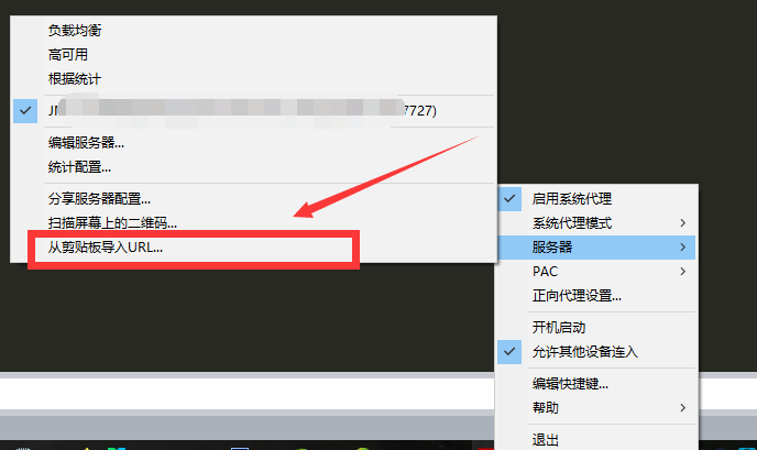 快速导入:打开ss程序后会出现小飞机的图标.右键单击小飞机.选择服务器,再选择从剪切板导入url.