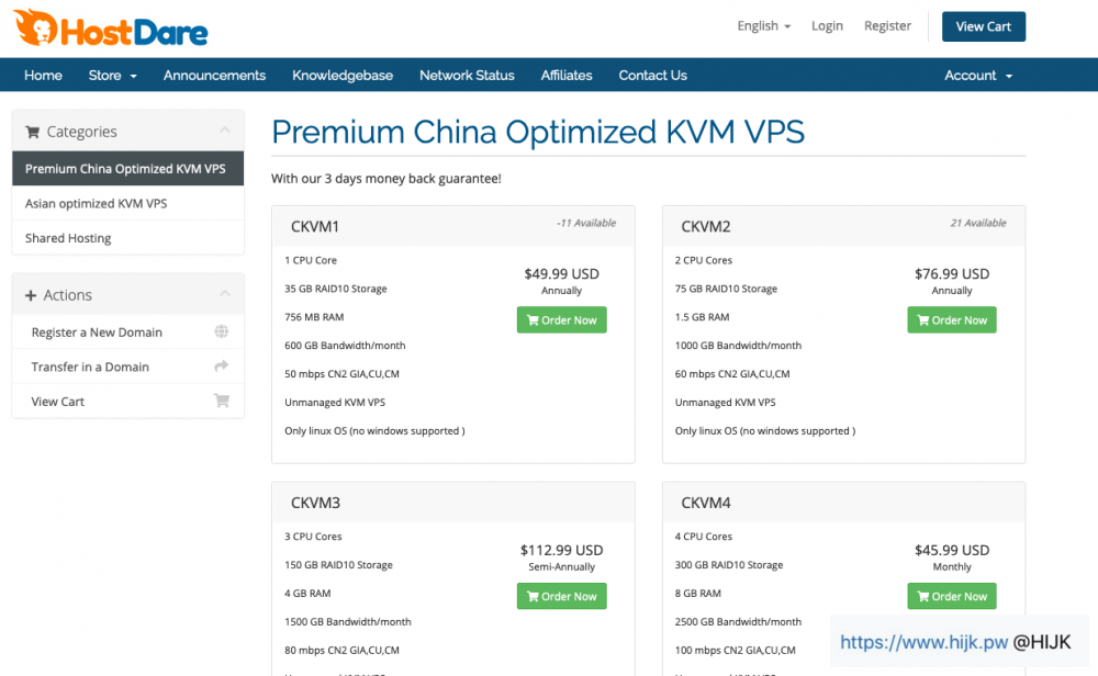 HostDare 是一家美国的vps服务商,官网是:https://manage.hostdare.com。因其客户多为中国人,因此机房针对中国地区的网络做了优化,电信走CN2 GIA/GT线路,联通和移动直连,速度上很不错。 HostDare 所有VPS提供3Gbps的免费DDos防护,价格月均不到4刀起,支持支付宝,对国内用户友好。