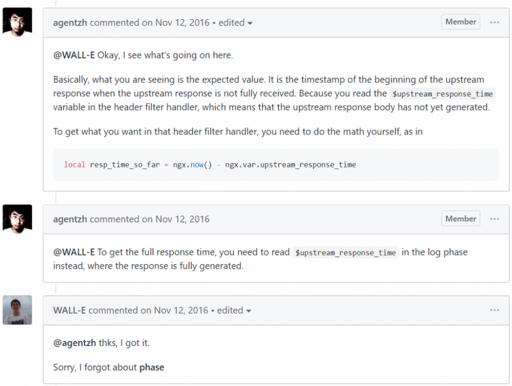 继续往下翻,马上就看到了有人在OpenResty提出的issue:[bug] the upstream-response-time value is wrong #206。根据Nginx与OpenResty的关系,这个issue肯定值得看看。章亦春大佬对该issue的回复(也是对upstream_response_time是时间戳的解答)是: