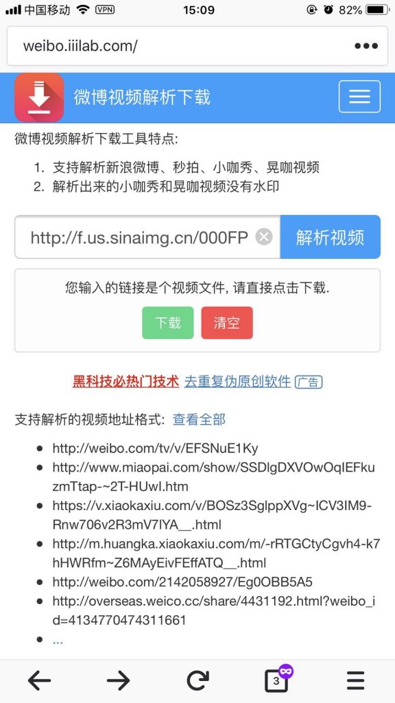 3. 解析视频的真实地址:解析twitter视频我用的 https://twittervideodownloader.com,微博用 http://weibo.iiilab.com,当然也可以使用其他能解析视频的网站。用Firefox浏览器打开解析视频地址页面,张贴复制的地址到输入框,点击解析,接着会看到页面上出现了“下载”按钮: