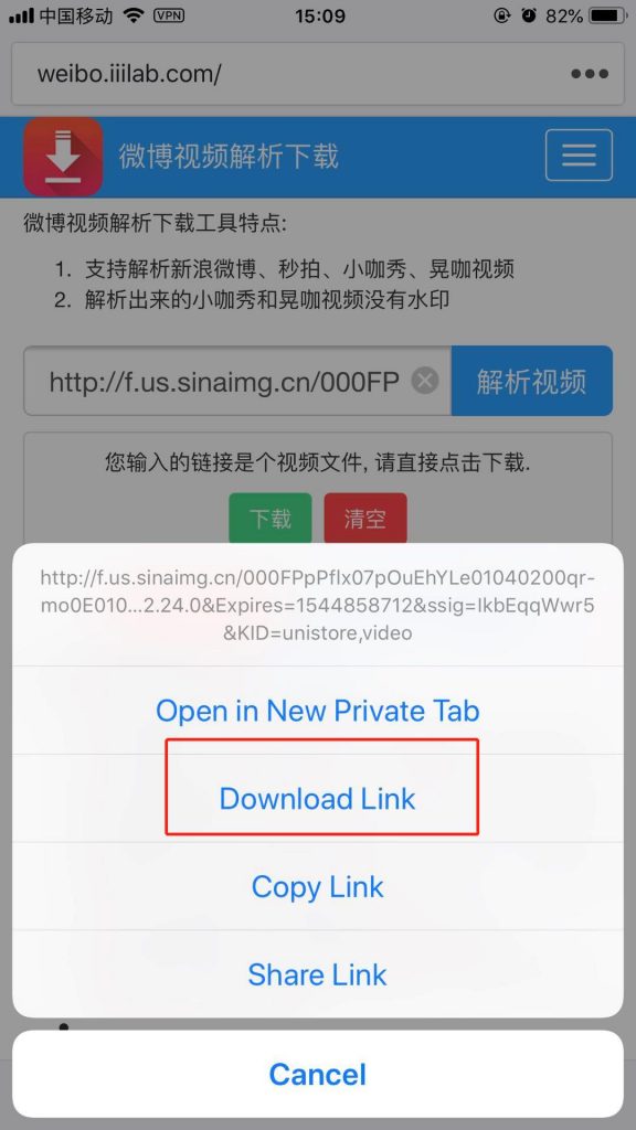 4. 直接点下载只会播放视频,这时需要长按下载按钮(相当于点鼠标右键),选择“下载链接”,把视频保存下来: