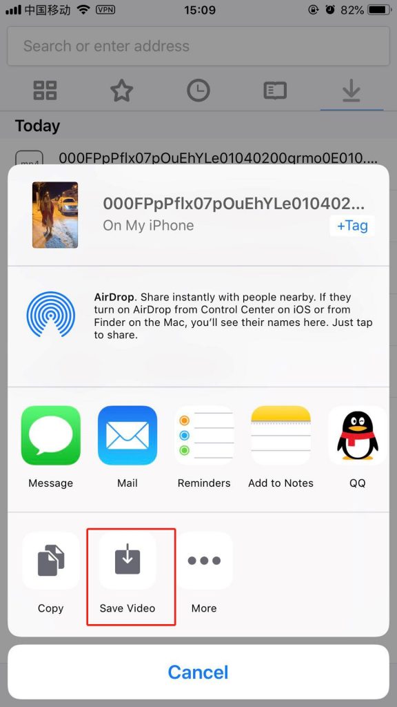 5. 由于iOS系统的尿性,视频不会出现在照片或者图库里。接着打开Firefox的“下载”页面,点击下载的视频,选择“保存视频”: