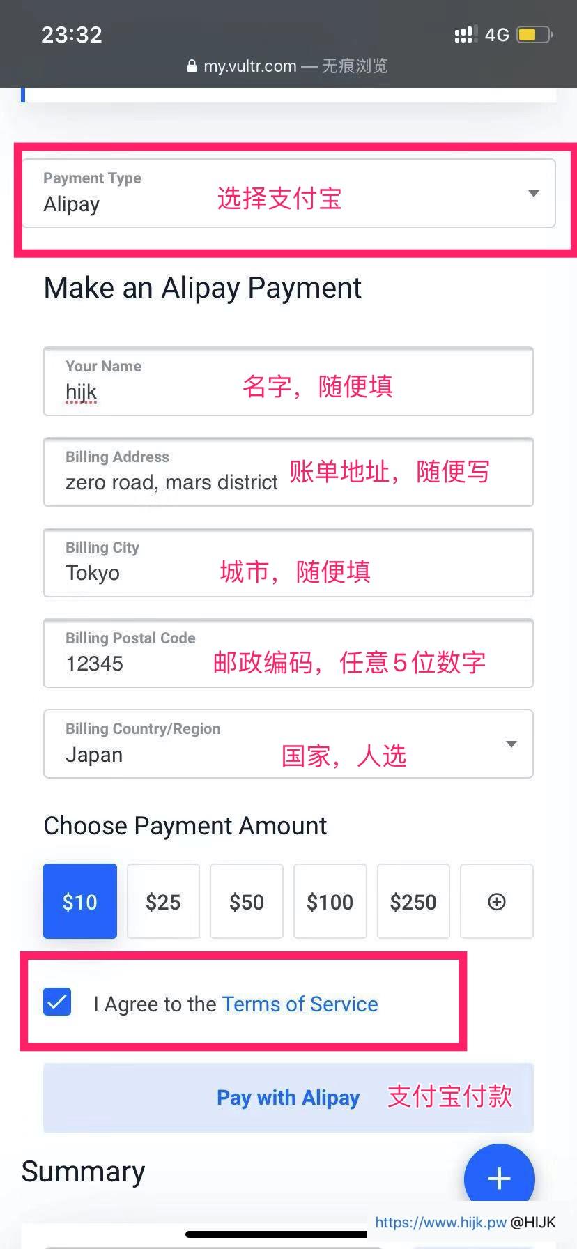 注册成功后,跳转到充值页面。这里我们选择支付宝(Alipay)付款(微信支付(WeChat Pay)操作类似),随便填写名字(your name),账单地址(billing address),任意选择一个城市(billing city),随便填一个5位数字邮政编码(billing postal code),随便选一个国家(billing country region),勾选同意协议(I Agree to the terms of service),点击下方的“pay with Alipay”付款按钮: