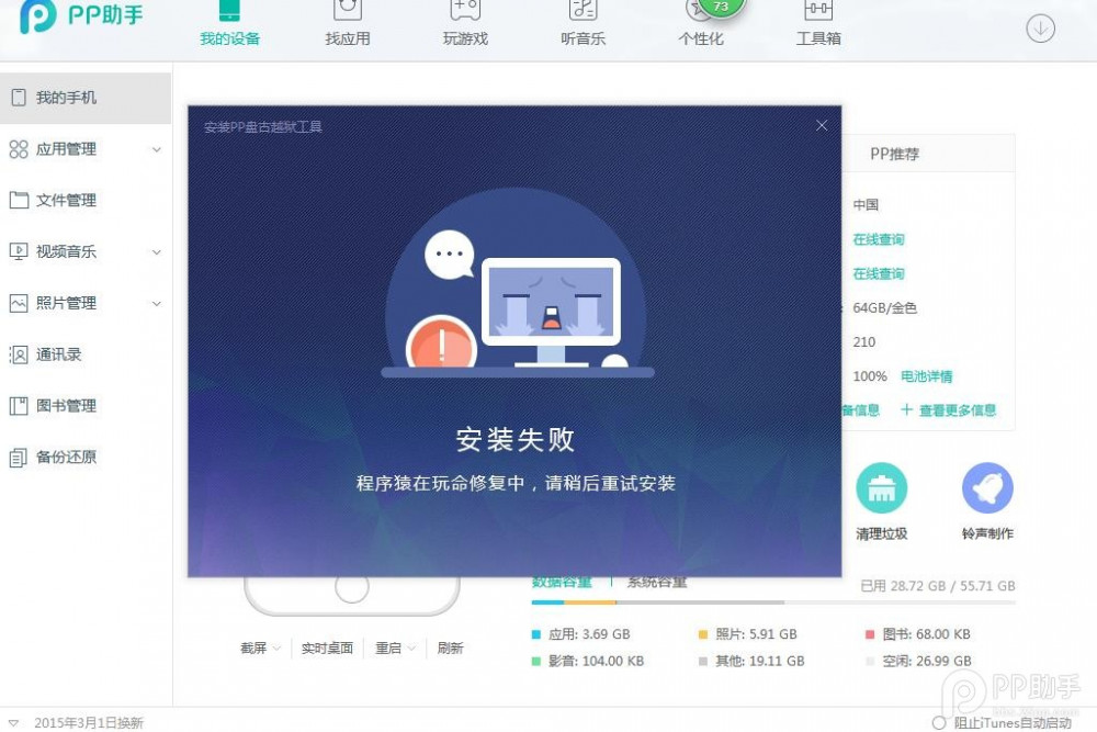 今天打开ipad,pp助手越狱版点击闪退,其他已安装软件也闪退。按照之前的做法,连接到电脑上,重新越狱一次即可。估计今天pp助手抽风,越狱时总是提示:“安装失败 程序猿在玩命修复中,请稍后安装”。重试了许多次依然如此,更新、重装皮皮助手也无济于事。