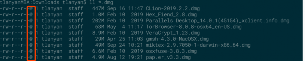 macos系统的ls -l(或者ll)命令输出第一列会出现@符号,而linux系统则不会。平时稍微留意了一下,带有@符号的多是从互联网上下载的文件,因此猜测可能是安全属性标志。