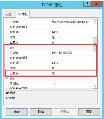 - 右键右侧的 TCP/IP 的属性,启用供外部连接的那个 IP 地址和端口。