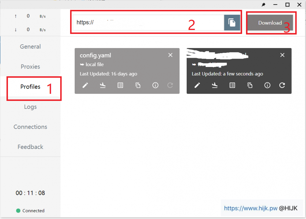 4. 如果你有机场或他人提供的订阅地址,请点击“Profiles”,粘贴网址,点击“Download”下载配置,双击选中下载的配置,然后跳到第九步: