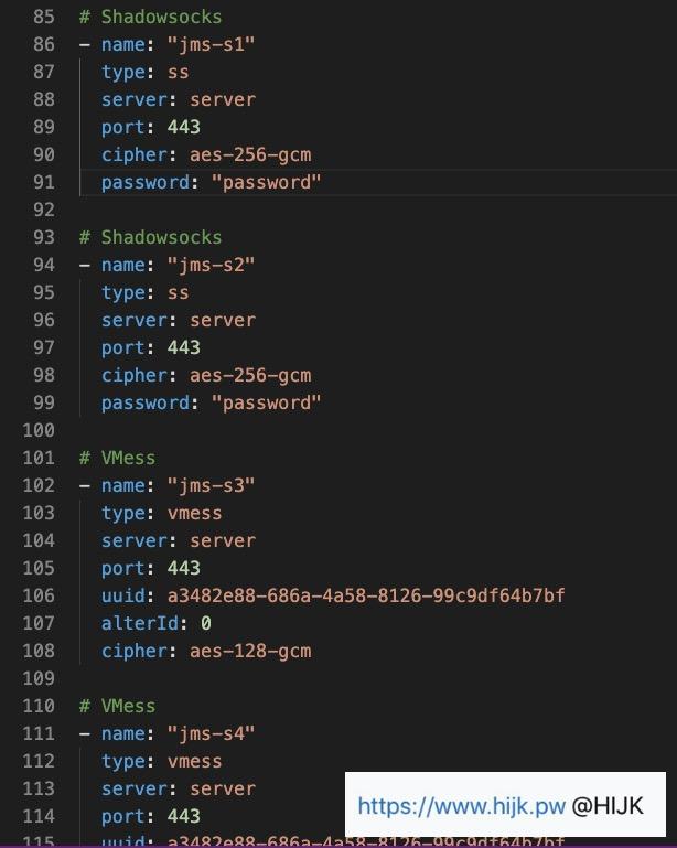5. 点击 https://www.hijk.pw/clash_jms.yaml 下载模板配置文件,用记事本、VS Code、Notepad++等编辑器打开,找到“jms-s”开头的配置块,把 server、port、password、uuid信息改成你服务端配置: