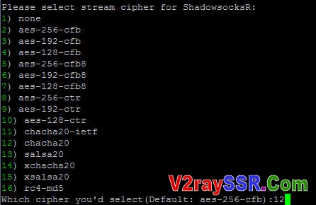 4.然后选择加密方式,如果选择chacha20的话,就输入对应序号12,按回车继续。