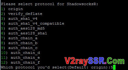 5.接下来选择协议,建议选择自auth_aes128_md5开始以下的几种,输入对应序号按回车。