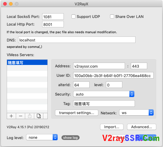 V2RayX 是一个基于 V2Ray 内核的 Mac OS X 客户端。