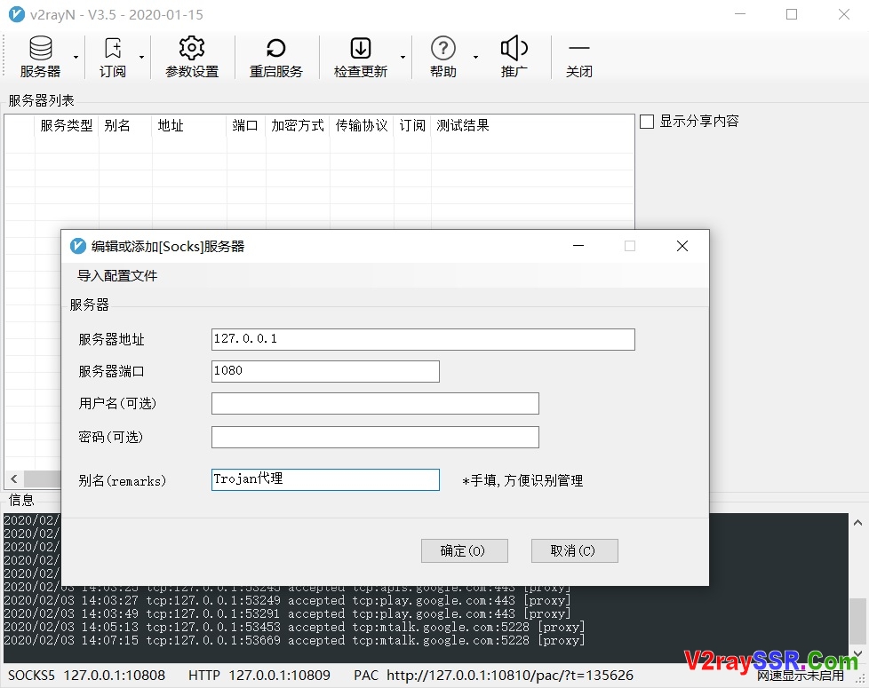 2、填写服务器地址“127.0.0.1”,服务器端口:“1080”,别名“随意填写”
