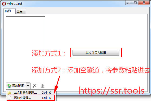 1.WireGuard客户端启动后的界面如下图,目前支持两种隧道添加方式。