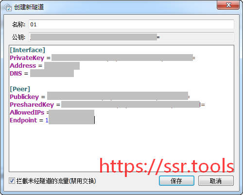 在WireGuard客户端中,通过方式2添加空隧道,在新的窗口中粘贴刚才复制的参数后保存即可。提示:下图中的名称一项,可以随意输入。