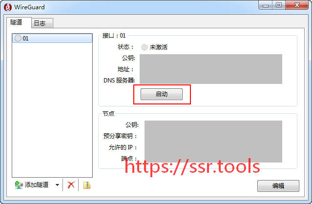 4.隧道添加完成后,WireGuard主界面如下图所示,点击其中的启动按钮,即可开启VPN代理通道。