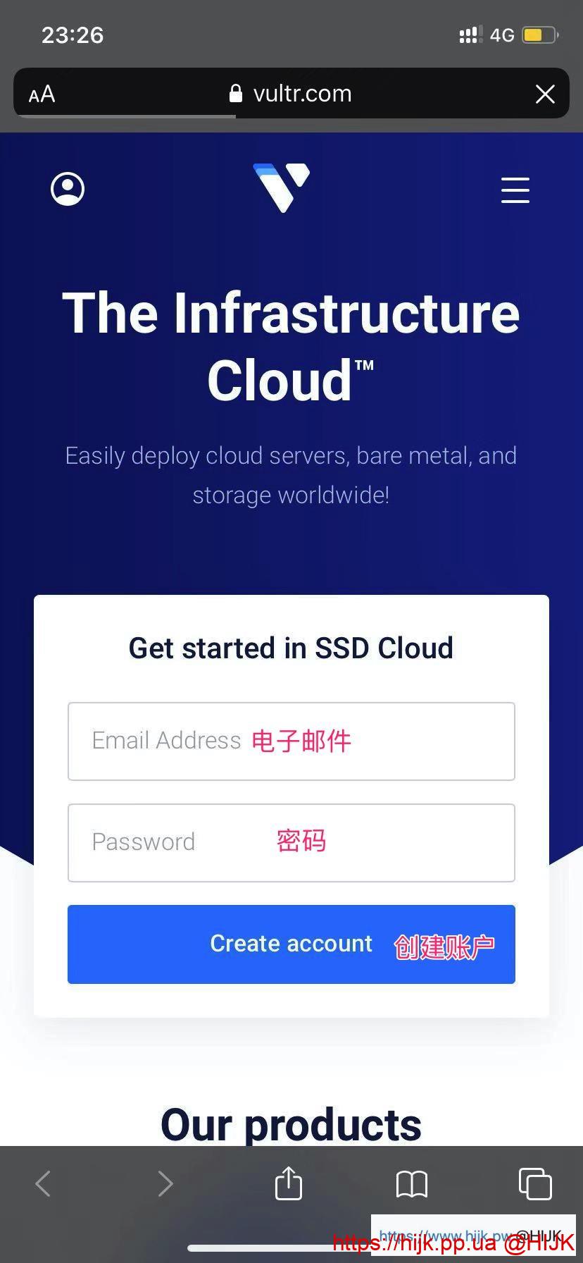 点击 vultr官网 这个链接打开官网,在主界面的表单里输入电子邮件和密码,然后点击创建账户按钮。注意:账户密码要求同时包含数字、小写字母,大写字母,并且不低于10个字符