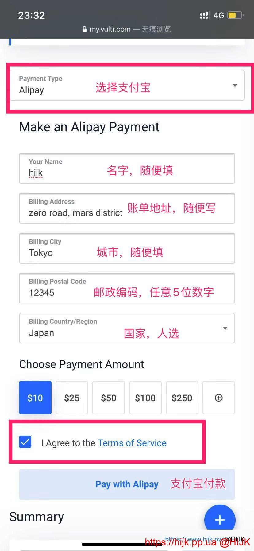注册成功后,跳转到充值页面。这里我们选择支付宝(Alipay)付款(微信支付(WeChat Pay)操作类似),随便填写名字(your name),账单地址(billing address),任意选择一个城市(billing city),随便填一个5位数字邮政编码(billing postal code),随便选一个国家(billing country region),勾选同意协议(I Agree to the terms of service),点击下方的“pay with Alipay”付款按钮: