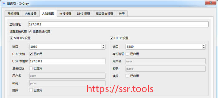 1.在首选项——入站设置 菜单下,可以设置Qv2ray的本地SOCKS5代理端口,以及HTTP代理端口。