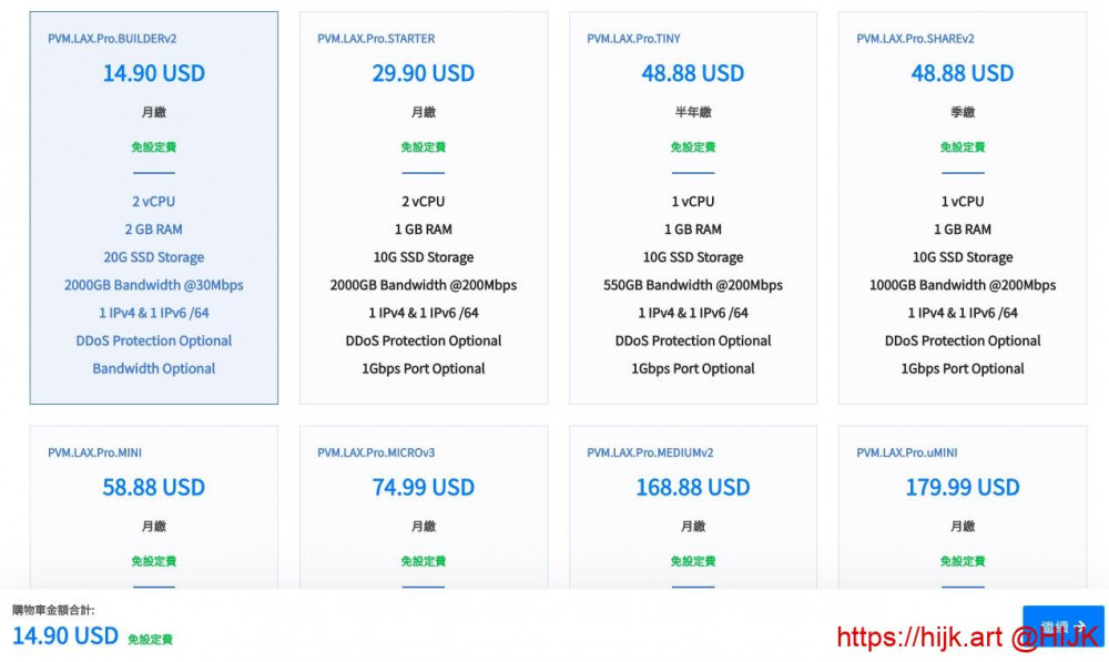 3. 接着选择服务器套餐。做网站建议选择第一款套餐(2核2G 30Mb带宽,月付14.9刀),科学上网建议选择其他大带宽套餐(14.9刀的也可以,但带宽有点小),例如第三款48.88刀半年款: