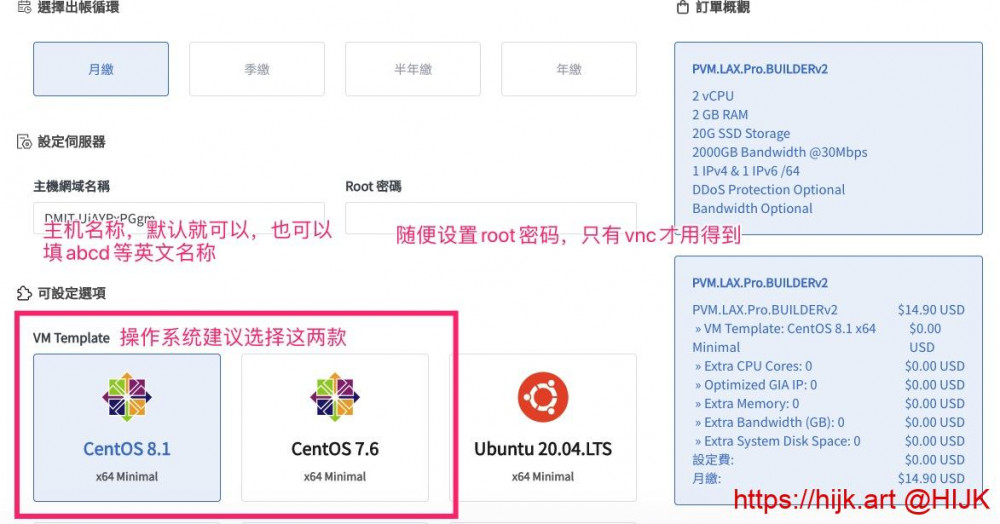 4. 选好套餐后,点击右下角的“继续”,进入服务器配置界面。首先是选择购买周期,可以月付、季付和(半)年付,然后设置VPS的名称和root密码,以及选择服务器操作系统: