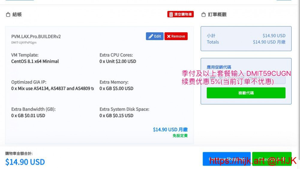 6. 服务器配置选好后,点击右下角的“继续”,进入确认页面。季付、半年付、年付可输入DMIT优惠码 DMIT59CUGN ,点击“校验代码”使用,续费时能优惠5%(当前订单不优惠):