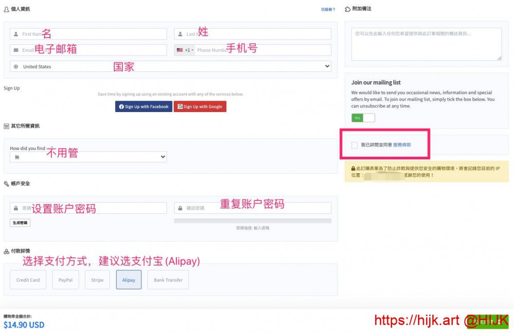 7. 确认无误后,点击右下角的“Checkout”按钮,进入付款账单界面。在界面中填写名字、姓、电子邮箱(非常重要,一定要填写对),电话号码和选择国家。以上信息中,除了邮箱,其他信息可以使用假信息,但不能太随意(比如名字填aaaa就太过分了)。往下填写账户密码(非常重要,用来登录官网),选择付款方式和勾选服务条款: