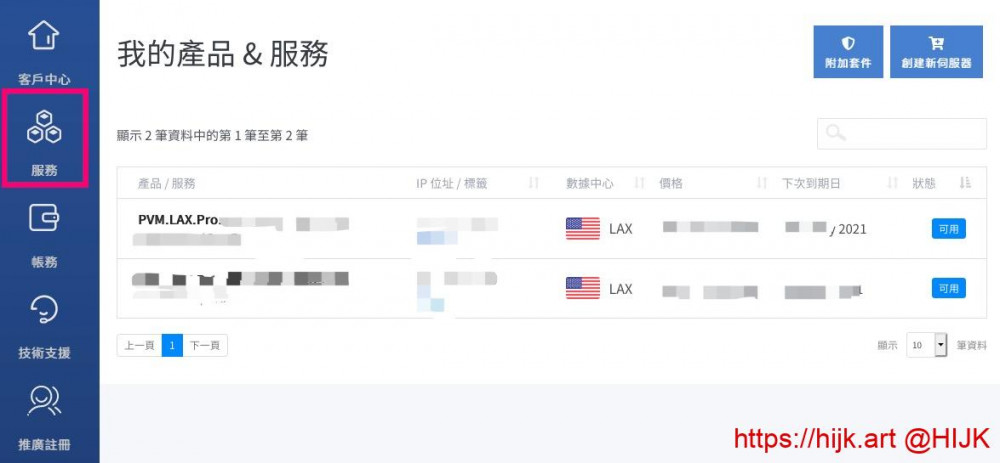 1. DMIT官网 点击右上角的“登录”(已登录则是“客户中心”),进入管理后台。点击左边的“服务”,查看订购的服务器: