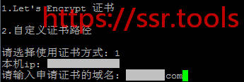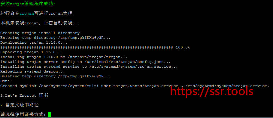 2.接下来脚本会自动完成Trojan服务器端的安装,出现下图界面时,输入数字1,开始申请SSL证书。