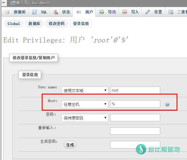 开启方法:在数据库——用户——编辑权限——登录信息中修改Host为任意主机“%”