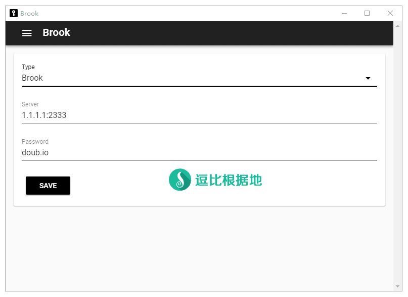 然后根据服务端设置的 模式/端口/密码 来填写客户端设置(注意服务端的协议模式是 新版Brook 还是 旧版Stream Brook),填写后点击 SAVE 按钮保存即可。