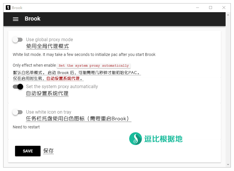注意:如果你要更换Brook账号,那么需要去控制页面修改账号信息并点击 SAVE 按钮保存,然后右键托盘图标点击 Toggle 才行!