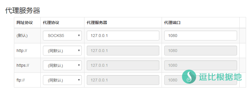 然后设置代理协议为 SOCKS5 ,代理服务器为 127.0.0.1 ,代理端口为 1080