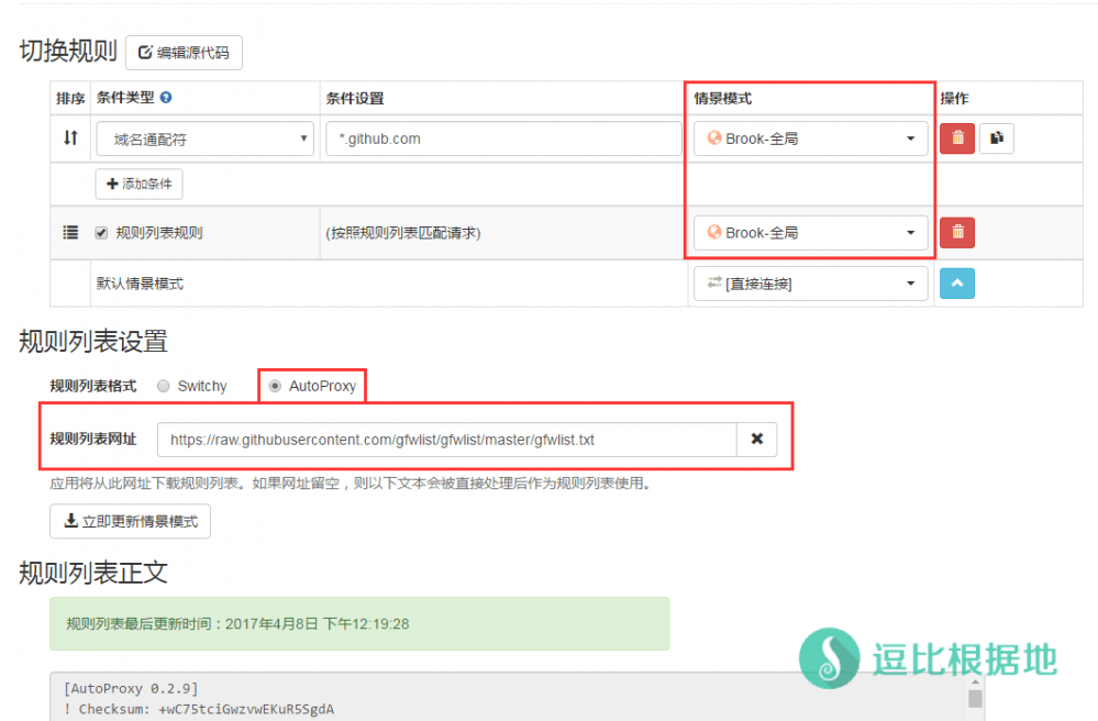 然后在规则列表设置中 规则列表格式选择 AutoProxy,
