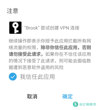 Brook安卓客户端和Shadowsocks/ShadowsocksR客户端一样,都是把代理转成 VPN,所以一开始会提示创建VPN 选择信任并确定即可。