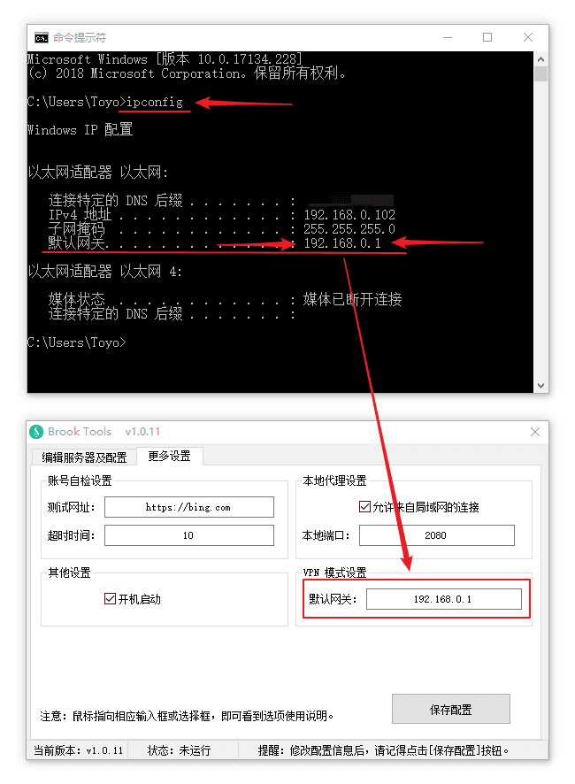 最后就是查一下你的网卡(网络连接)默认网关并填写到 Brook Tools 中即可。