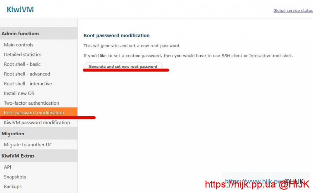 2. 点击左侧菜单的 “root password modification”,点击 “generate and set new password” 重置密码: