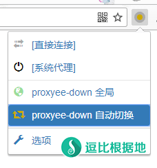 最后,我们点击浏览器右上角的 SwitchyOmega 按钮,选择 proxyee-down 自动切换 即可。