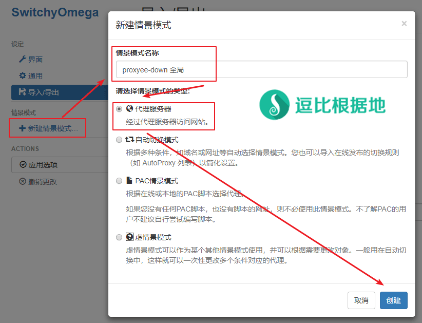 如下图所示,情景模式名称:proxyee-down 全局 ,情景模式类型:代理服务器 ,然后点击 创建 按钮。