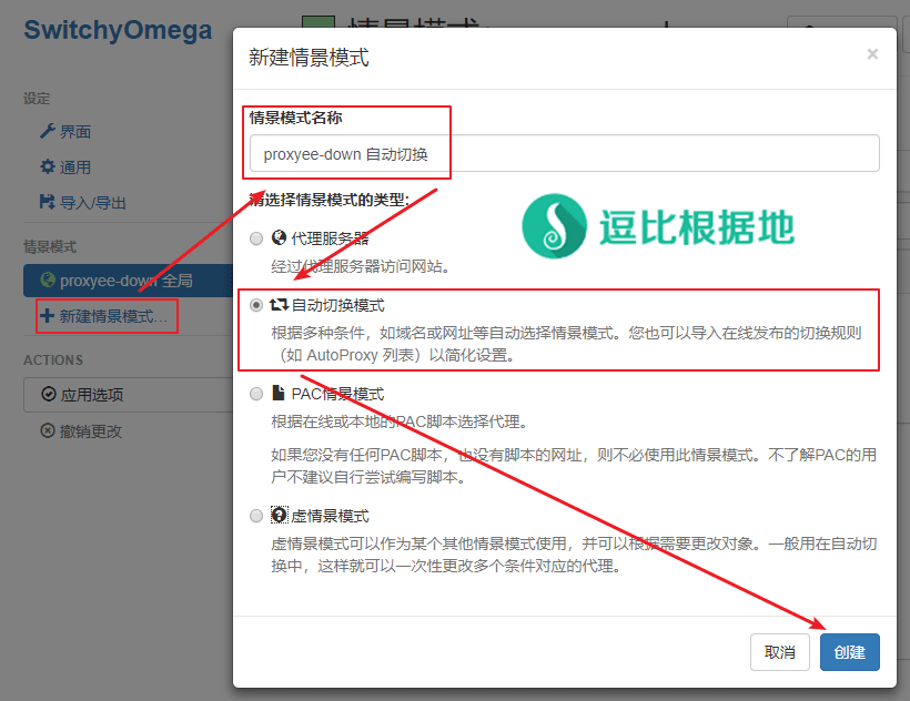 如下图所示,情景模式名称:proxyee-down 自动切换 ,情景模式类型:自动切换模式 ,然后点击 创建 按钮。