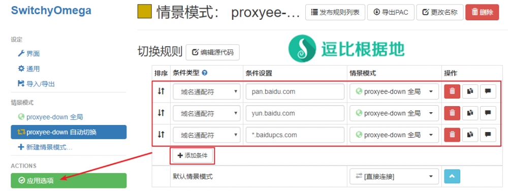 条件类型:域名通配符 ,条件设置:pan.baidu.com ,情景模式:proxyee-down 全局