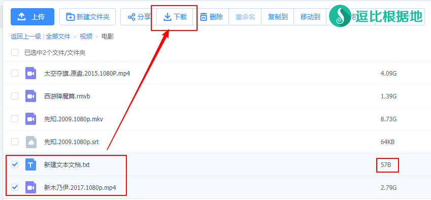 最后如下图所示,勾选刚才上传的 新建文本文档.txt 和 要下载的文件,然后点击 下载按钮。