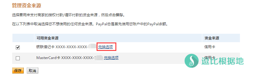 这里会列出你的所有资金来源,点击你的 银行卡/信用卡 卡号后面的 兑换选项 。