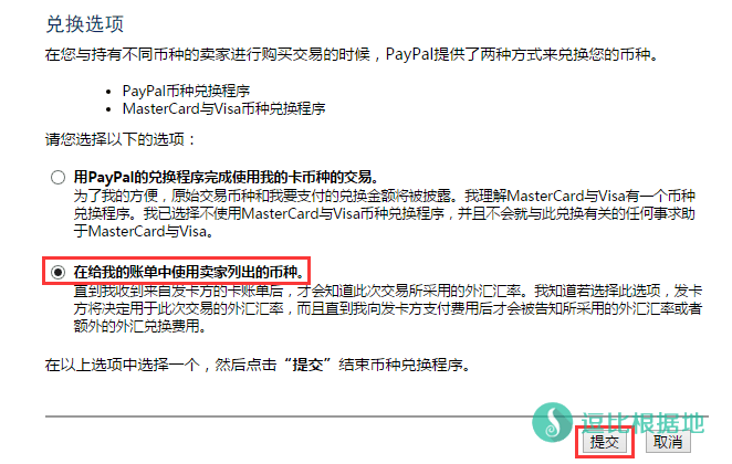 然后会出现下图,并且默认选择的是:用PayPal的兑换程序完成使用我的卡币种的交易
